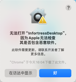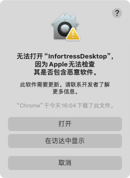 - 打开 “应用程序” 文件夹,找到 Infortress 客户端图标并双击,若弹出 “无法打开” 的提示弹窗,点击弹窗中的 “在访达中显示”。